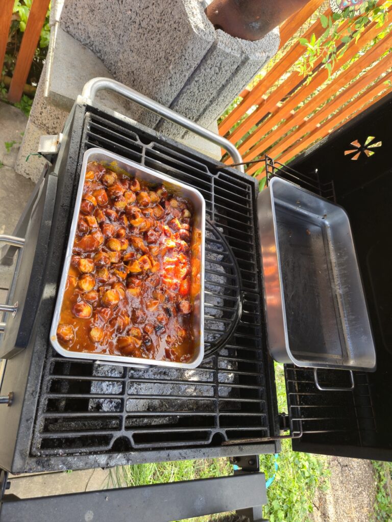 Nach dem sorgfältigen Zusammenkippen aller Zutaten – inklusive einer unbestimmten Menge Bratensaft, Hoffnung und einem Hauch Chaos – wanderte der Bräter auf den Grill. Und dann hieß es: warten. Wie lange? „Ja so… zwei, drei, vielleicht vier Stunden. Is’ eigentlich Wurscht – Hauptsache warm“, so die offizielle Garzeit.